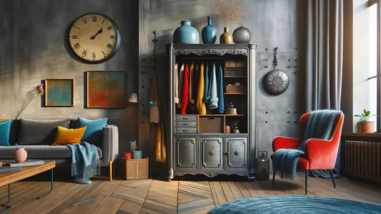 Per un approccio moderno, scegli una combinazione di colori più sobria e naturale. Ad esempio, puoi dipingere un vecchio armadio metallico in un elegante grigio antracite, mantenendo l’interno nelle sue vivaci tonalità originali come sorpresa visiva all’apertura.